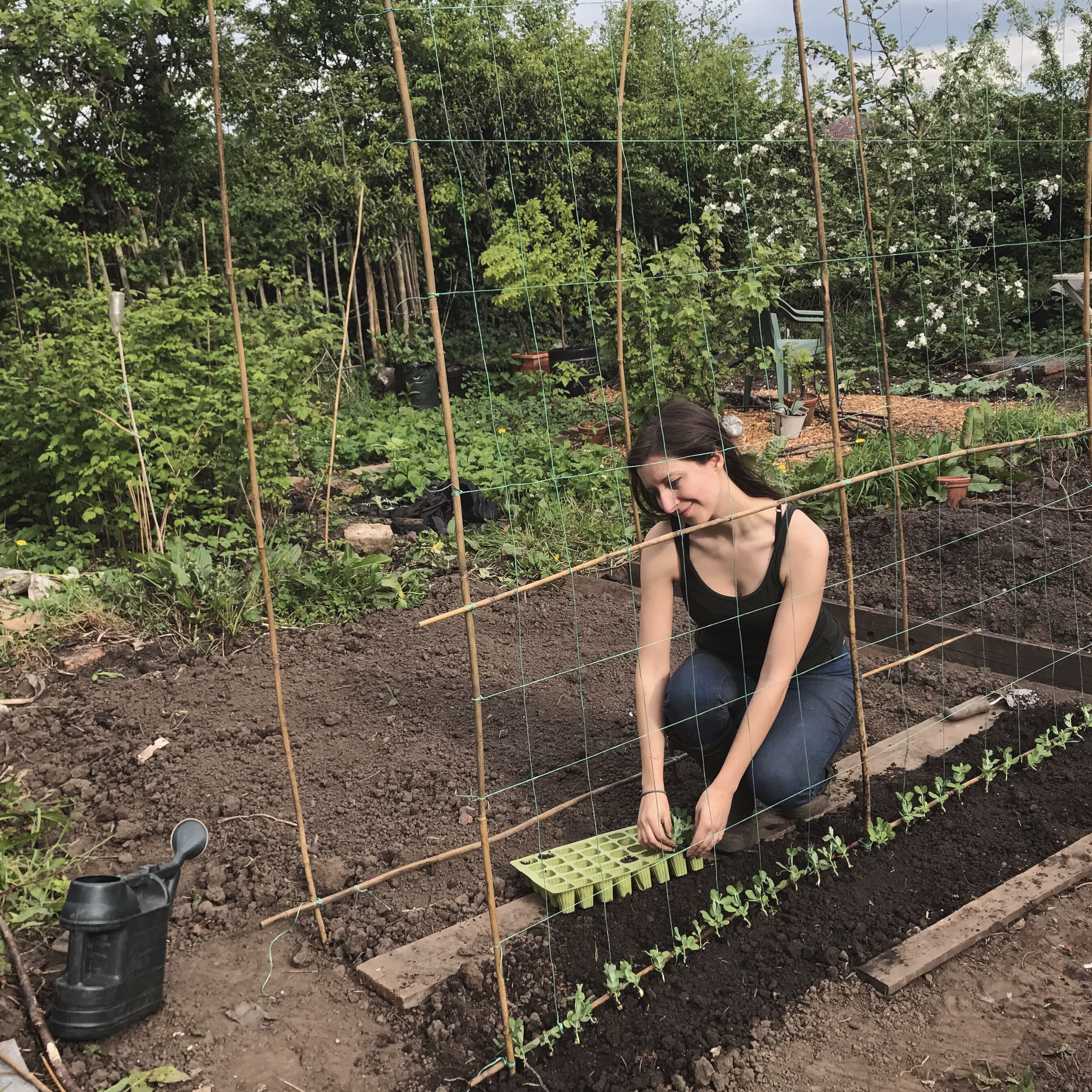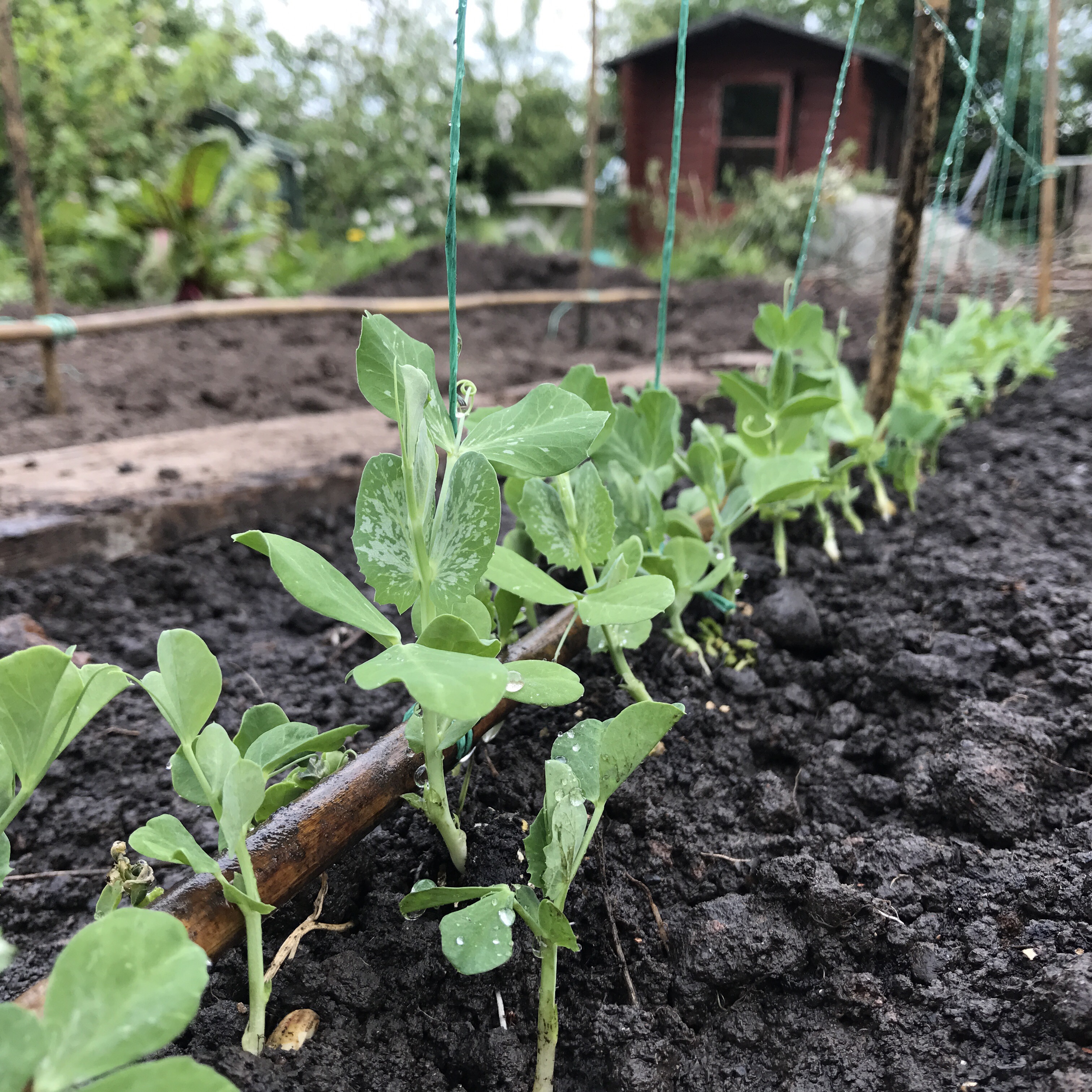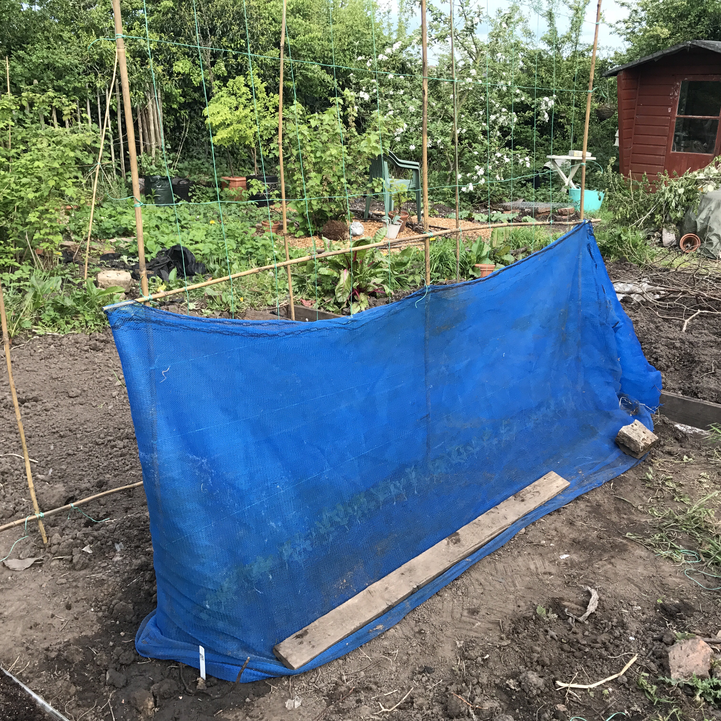 Last year’s peas (Kelvedon Wonder) were supported by two short rows of hazel sticks, as they grew less than a metre tall. The sugar snaps can grow above 6 feet tall, so this year I made a bamboo & string trellis structure for them to climb. The Waverex on the other hand will have a smaller trellis, just 1m high, so a shorter version will sit next to them. Before plating the peas, I gave the tench a good layer of manure and a generous drink once they were in. It has been very dry after all and peas love cool, moist soil! Oh I remembered to cover the peas with netting to protect them from the wood pigeons. ![]()