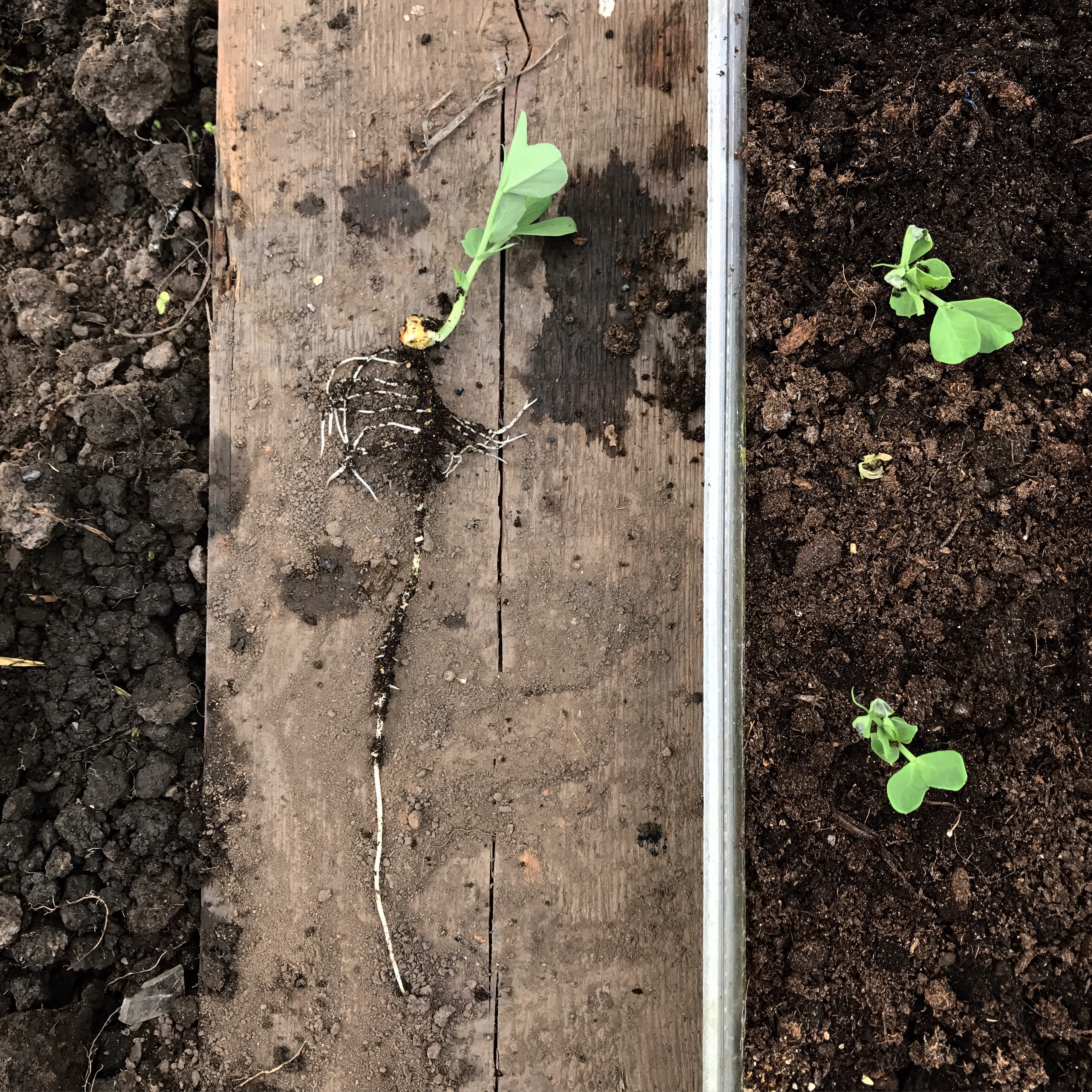 I’m growing two varieties, sugar snap peas and also a variety called Waverex, better known as the petite pois. I made my second sowings in 2m long light fittings that I picked up from the allotment yard last year and was surprised to find them growing quite happily and with healthy roots too, despite the shallow depth. However, I didn’t want to leave them in there to long so I planted them out on Bank Holiday Monday.