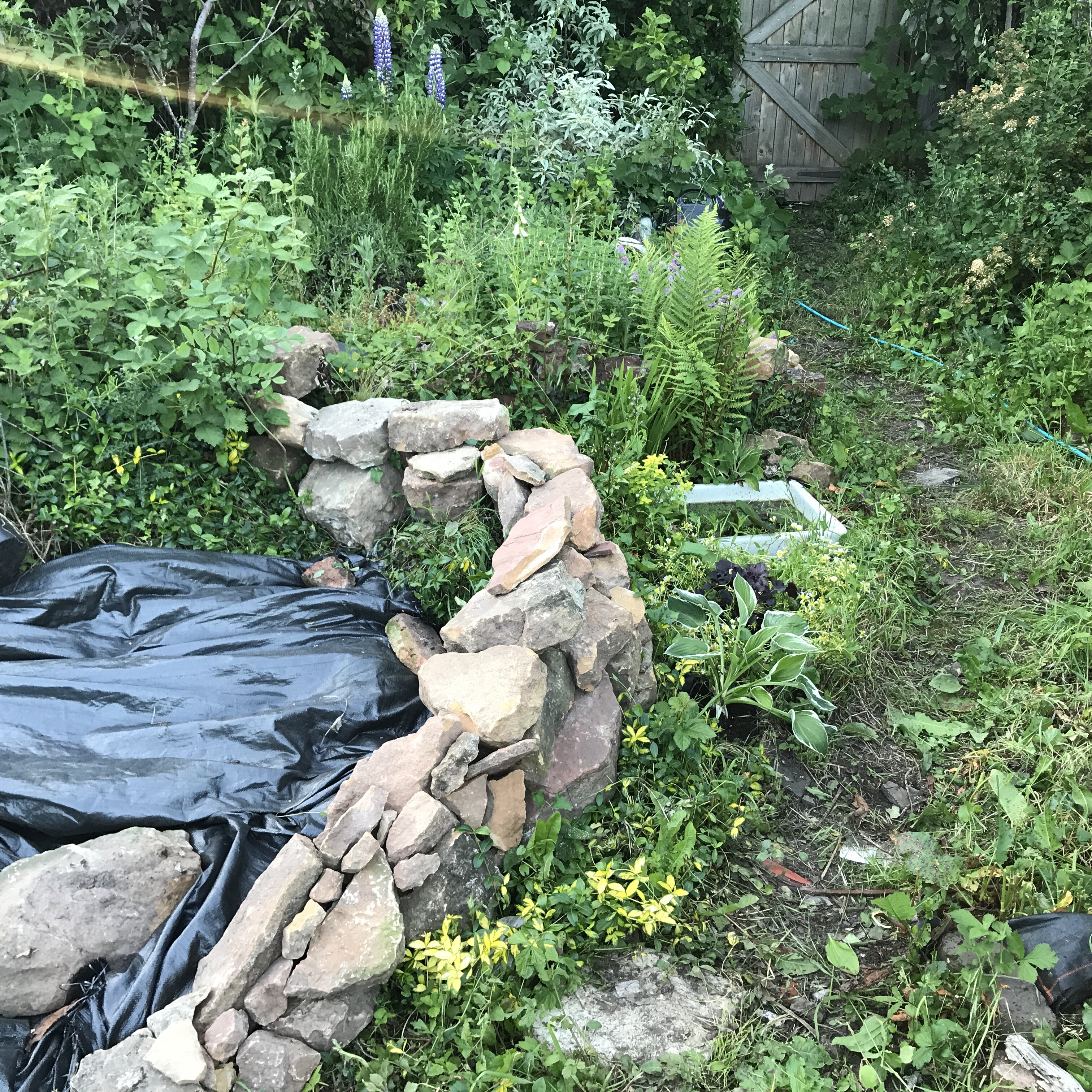 It was beginning to get late. I had not only made many trips to get the rocks, but the wood chip too! As I began to unload the rocks around the pond, I realised I was building a small wall. So, I continued to make it the following day to give the pond/wildlife area more structure and a place for the frogs and newts to hide.
