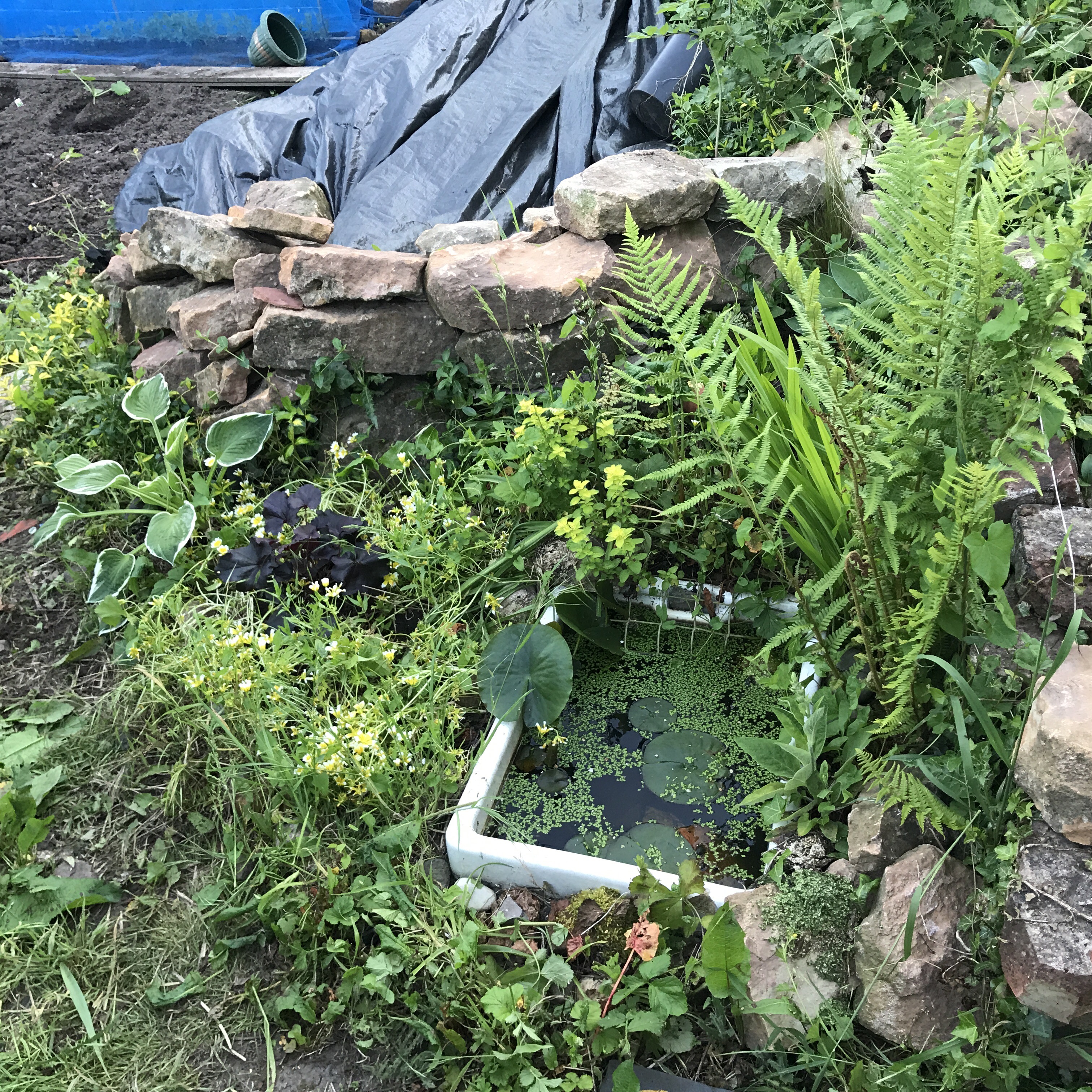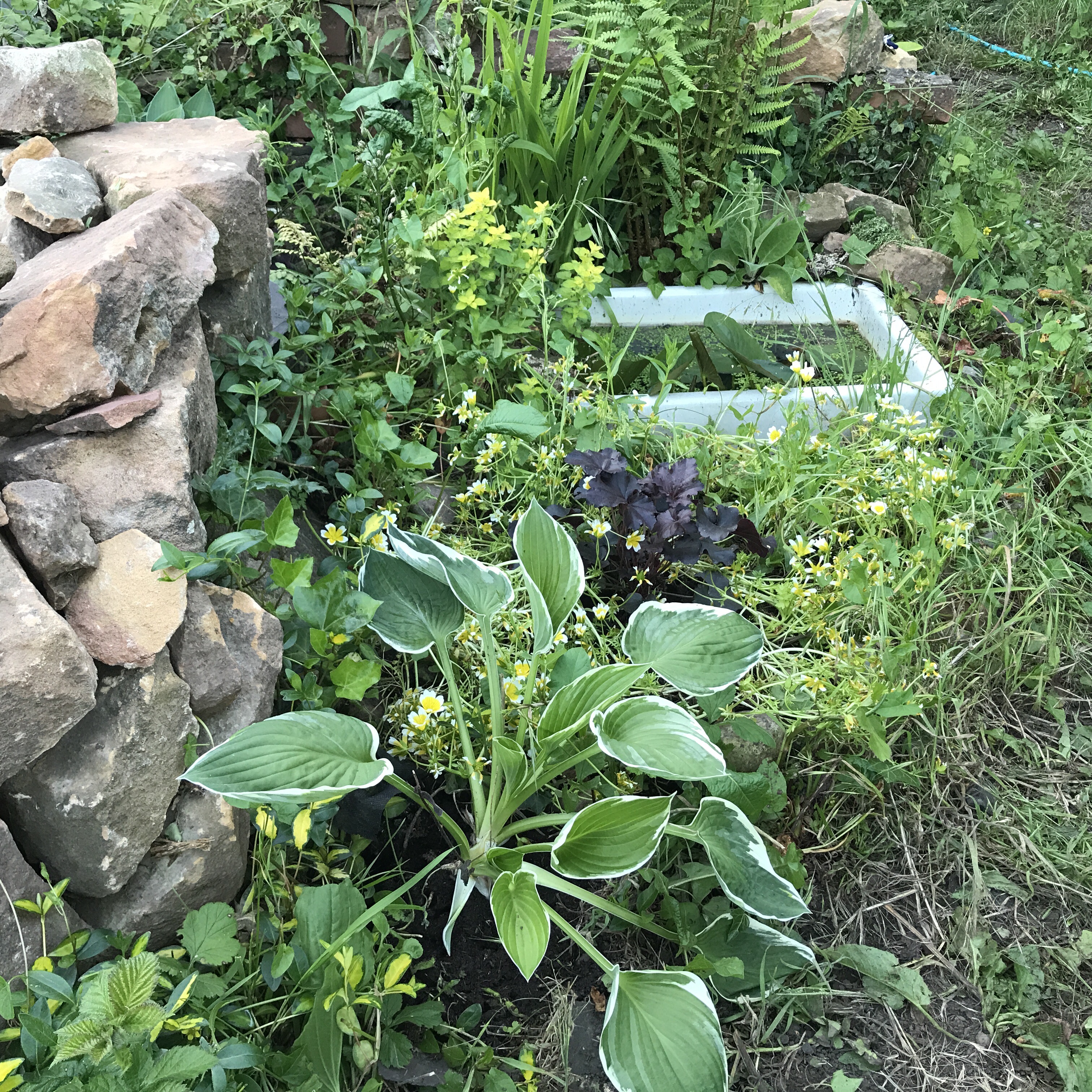 Please excuse the black tarp in the photos. I’m attempting to cover part of that big weedy area to prevent it from spreading. It’ll look pretty one day! After I built the wall, I planted a new hosta and heuchera. I couldn’t resist the rich, contrasting colours when I picked them up from Asda for just £3 each!