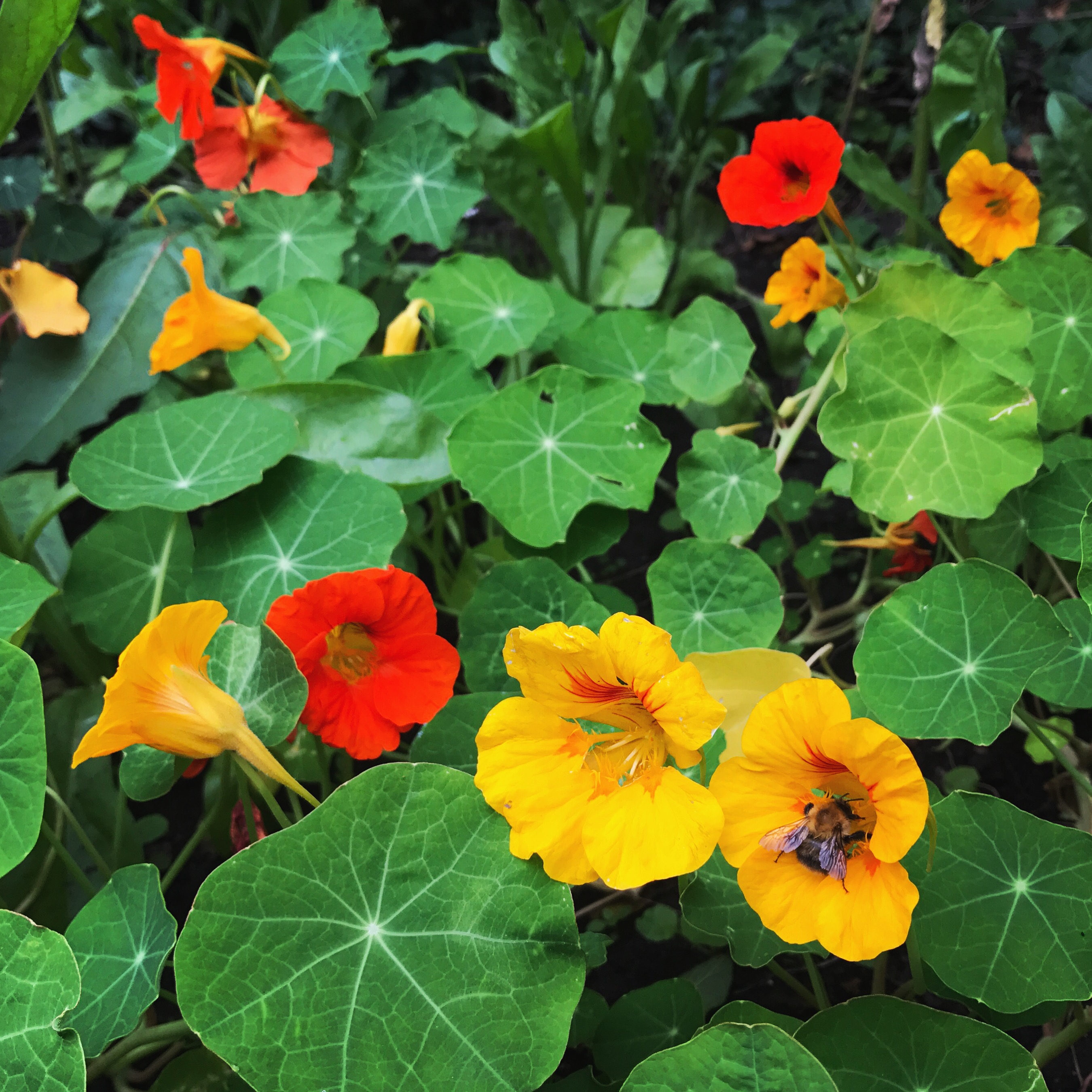 The sunflowers might not be in bloom just yet, but the nasturtiums below are in putting on a fantastic display and the bees just cant get enough of them! π»πΌπ